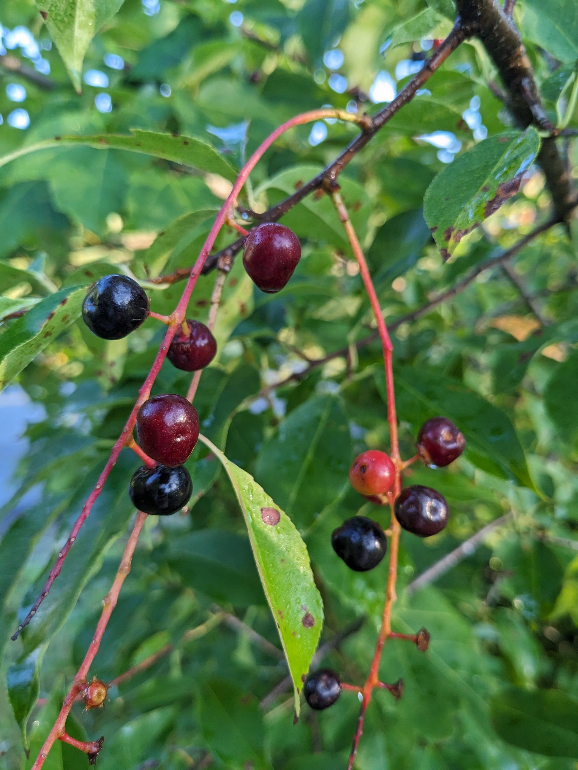 Large shrub/small tree native to North America. Heavy clusters of white flowers in the spring give way to dark red fruit in late August/september. Loved by birds and other wildlife. Popular for making jams, jellies, syrups and wine. Closely related to the black cherry. Susceptible to black knot and tent caterpillars. Can be poisonous to livestock so keep out of pastures. (zone 3)